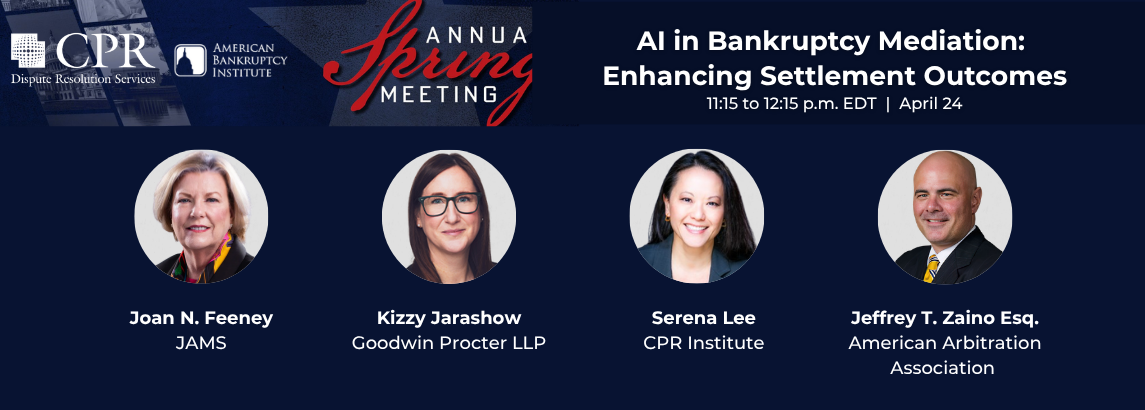 Join CPR Institute President and CEO, Serena Lee at the American Bankruptcy Institute (ABI) in Washington DC for the 2026 Annual Spring Meeting, one of the most significant annual gatherings of bankruptcy and insolvency professionals in the country. ABI’s Annual Spring Meeting provides the ultimate in learning and networking opportunities for the insolvency community.