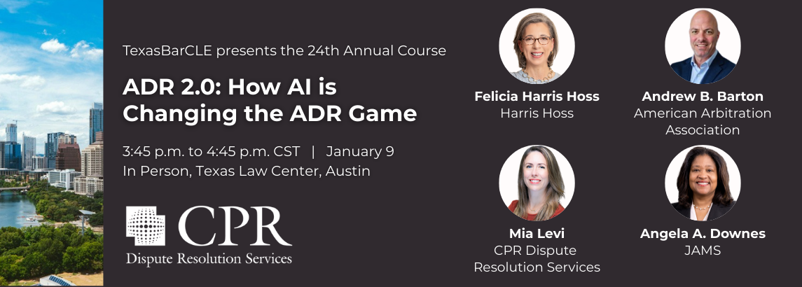Join the CPR Dispute Resolution Services’s Mia Levi, who will be speaking at the Advanced Alternative Dispute Resolution course on a panel titled "ADR 2.0: How AI is Changing the ADR Game," on January 9 from 3:45 p.m. - 4:45 p.m. (CST).