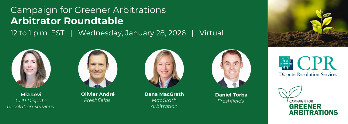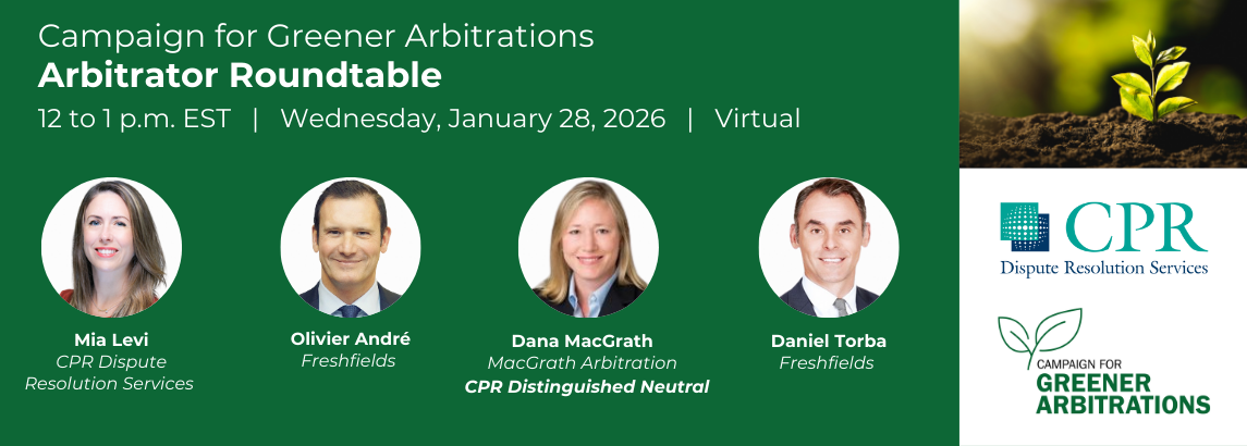 The CPR Dispute Resolution Services and the Campaign for Greener Arbitrations North America Committee are organizing a workshop with the CPR Panel of Distinguished Neutrals to discuss the CGA and its Green Pledge Protocols, as well as share valuable insights into what arbitrators can do to become more eco-friendly. Additionally, we will explore the latest tech tools that can help arbitrators work more efficiently and make proceedings greener.