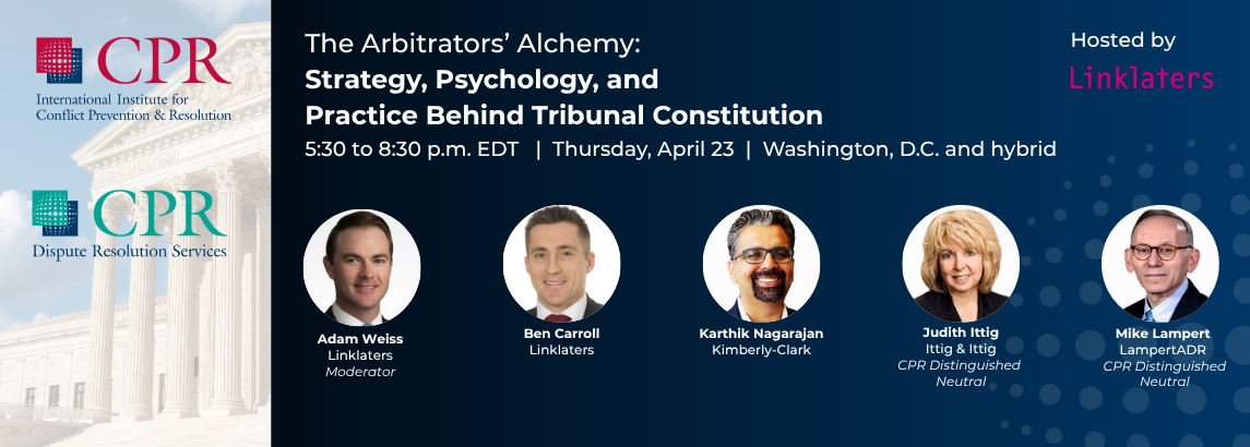 In this jointly hosted CPR-Linklaters program, a distinguished panel of experienced in-house counsel, leading external counsel, and seasoned arbitrators will engage in a dynamic and substantive discussion* that goes beyond abstract principles to illuminate the realities of tribunal formation.